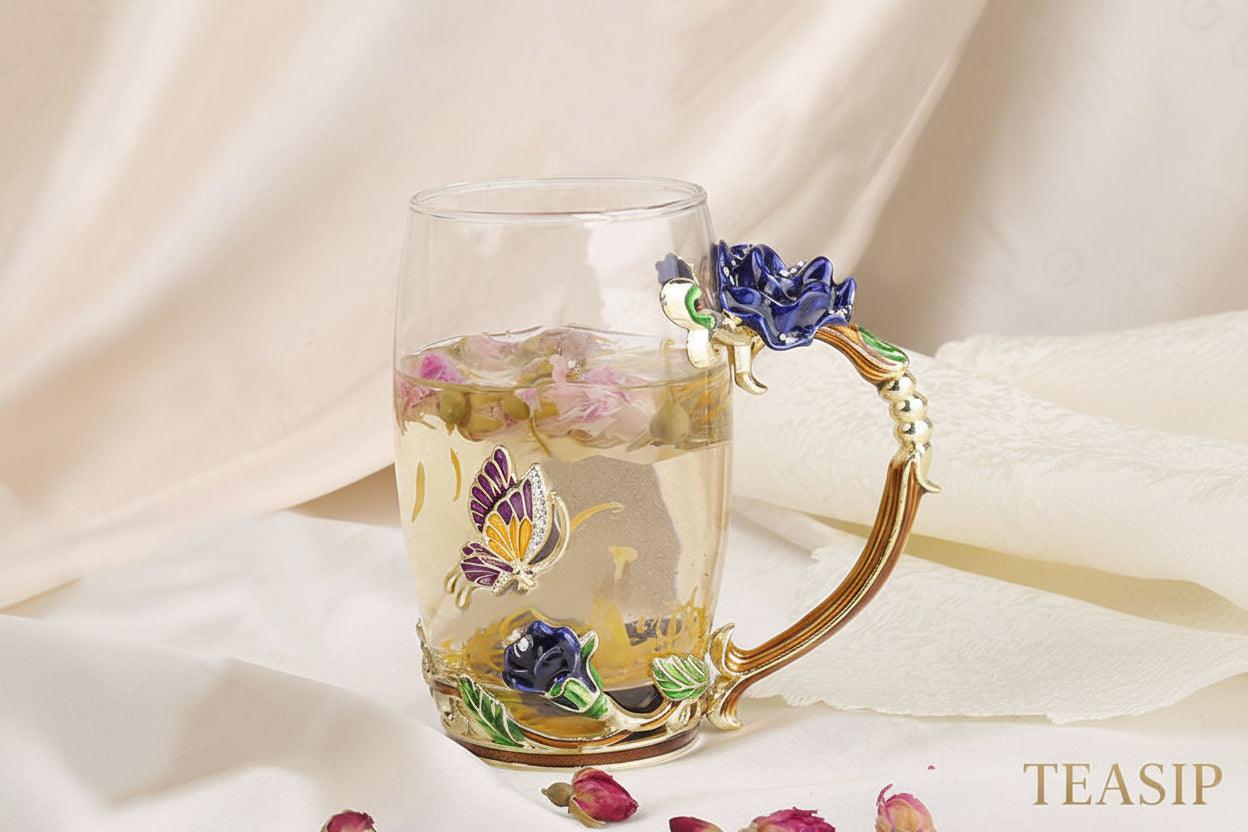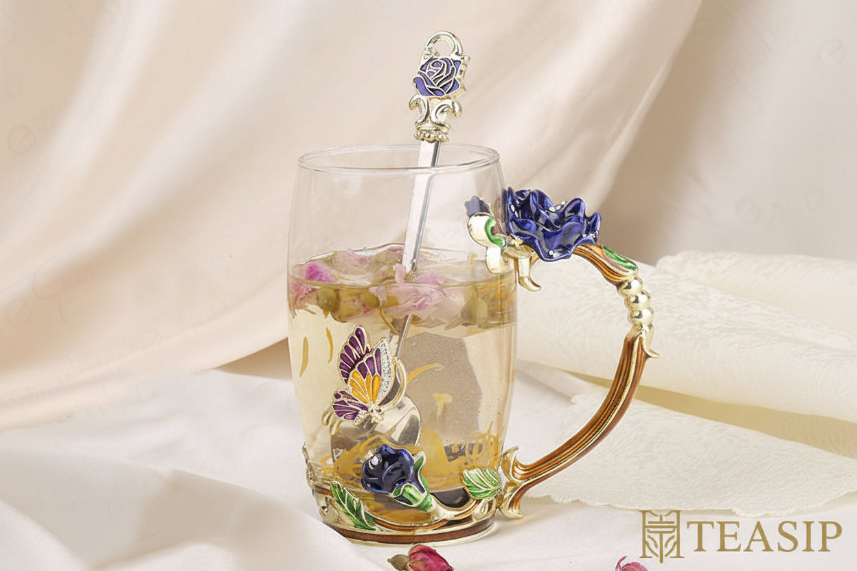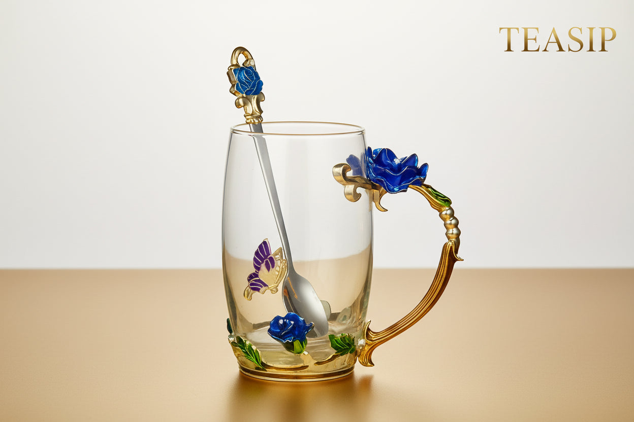 Enchanted Rose Glass Tea Cup with Spoon - This exquisite handmade cup features an elegant enamel butterfly and rose pattern, crafted from clear glass. Ideal for sipping tea or coffee, it serves as a perfect gift for birthdays, Mother's Day, Valentine's Day, Christmas, or any special occasion.